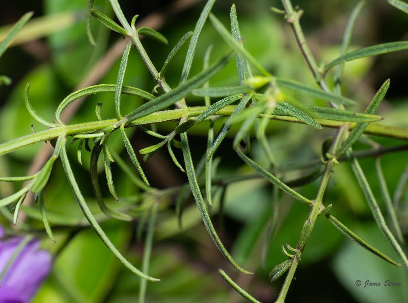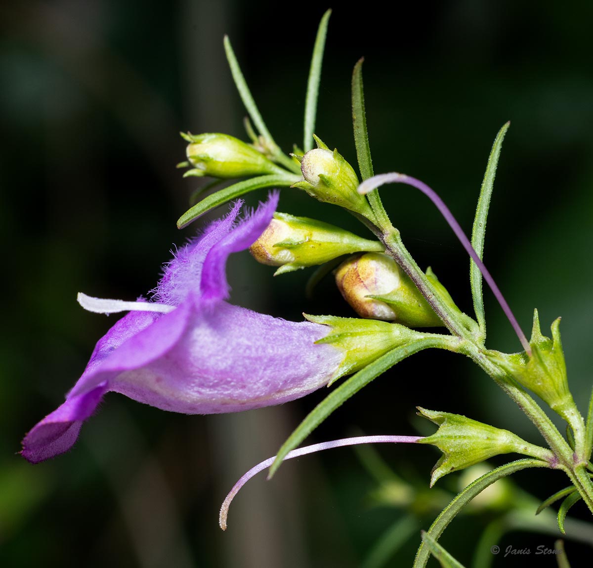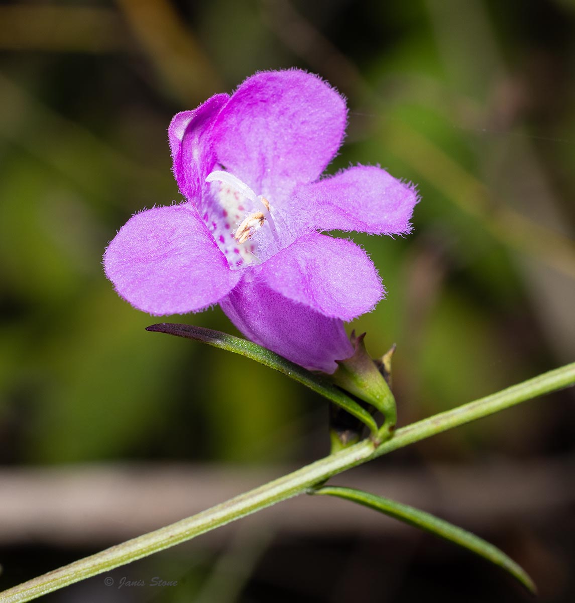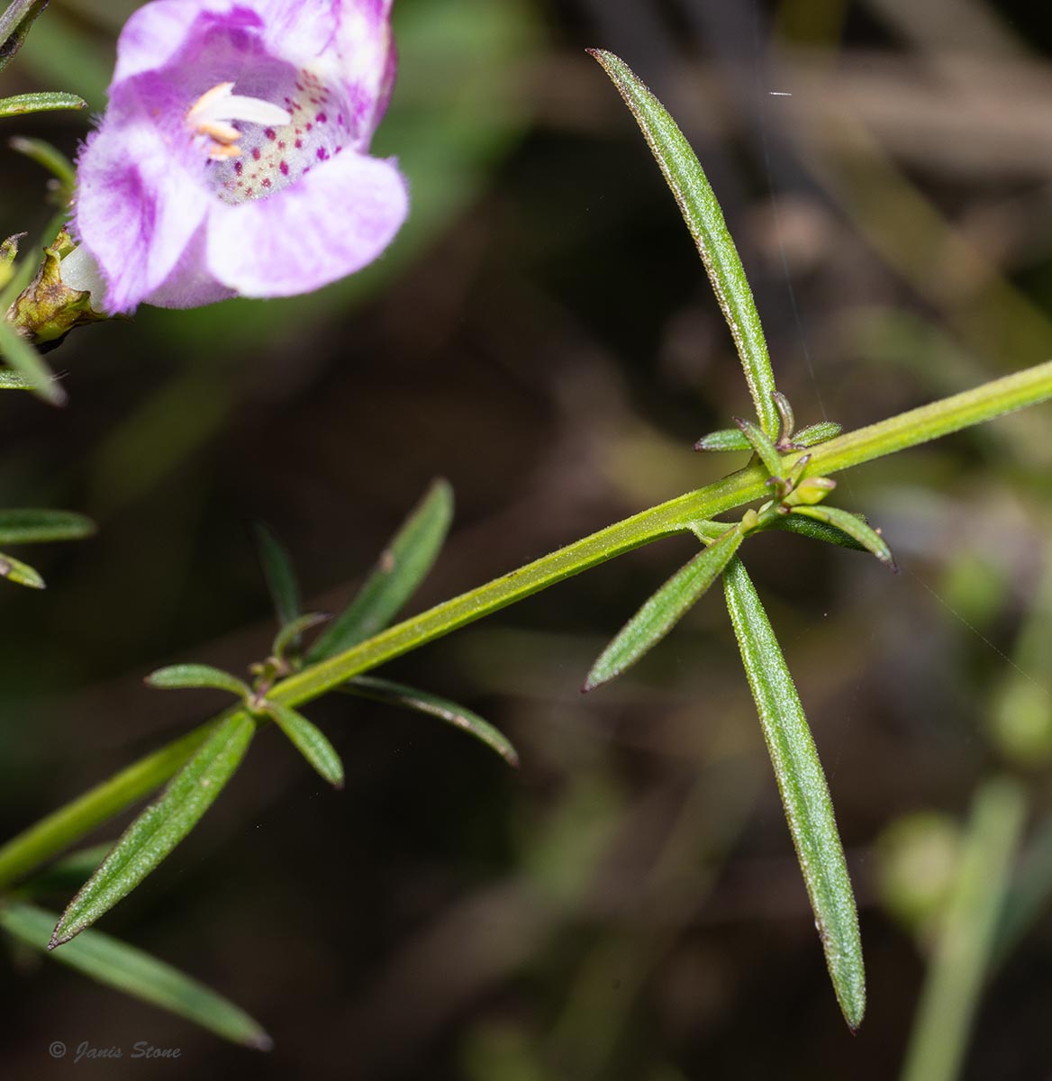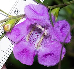 Purple False Foxglove has bright rose-purple flowers with yellow-lined corolla throats. The flowers are held up by pedicels that are less than 1.5 times as long as their calyx and it has green leaves, which makes it readily distinguished from Slender False Foxglove (Agalinis tenuifolia).