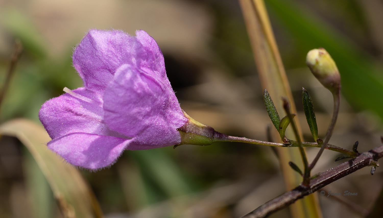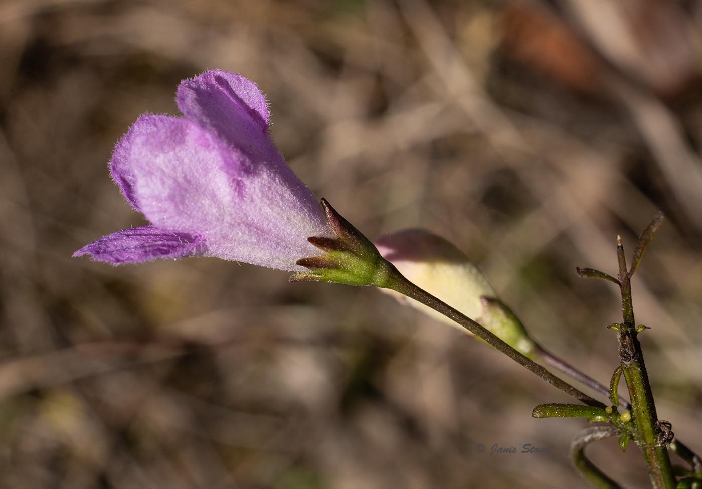Slender False Foxglove is named for its narrow leaves, which have a purplish pigment. Its purple flowers are held up by pedicels that are more than 2.5 times as long as their calyx, and the upper lip of the corolla is arched forward over the stamens (not erect or reflexed). The corolla throat is glabrous or nearly so.