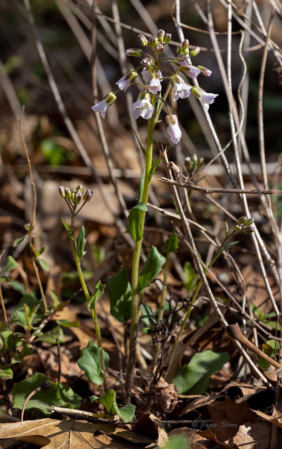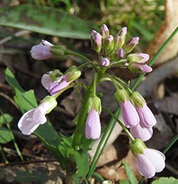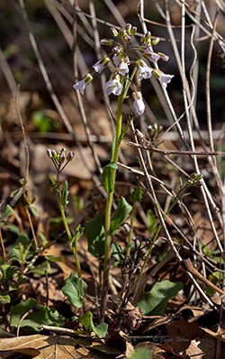 Identification Caution: Purple Cress (Cardamine douglassii) and Spring Cress (Cardamine bulbosa) are often nearly impossible to differentiate in the field. Many of their defining characteristics overlap, further complicated by them hybridizing in locations where they both can grow. Perhaps the most quoted source for their identification is a 1976 paper by Hart and Eshbaughi in the Journal of the New England Botanical Club1.
