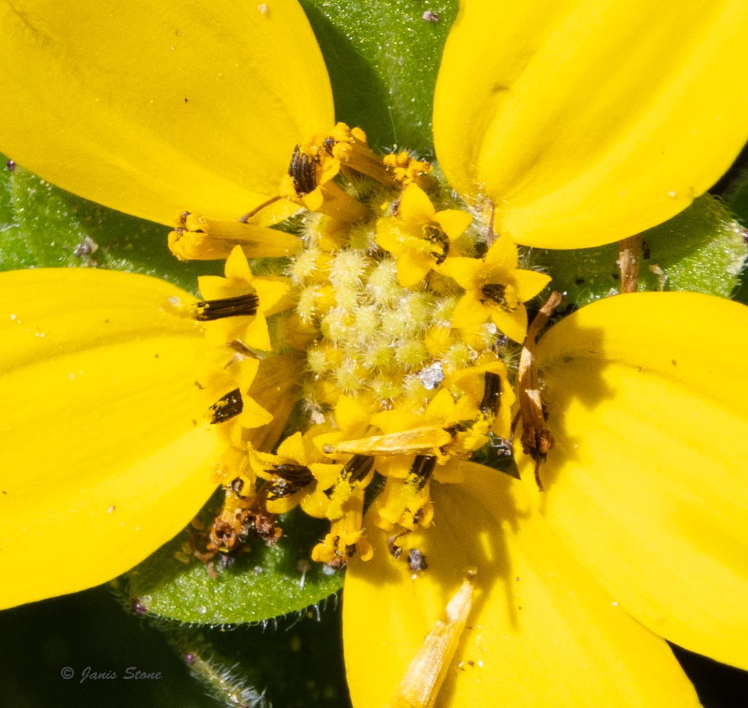 Green-and-gold gets its common name from its vibrant green leaves and bright yellow ray florets. Like all asters, it has a compound flower head (capitula) with many tiny individual disk florets.