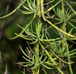 Hyssop-leaf Thoroughwort's leaves are long and narrow, and are toothless or nearly so, and are borne in whorls.