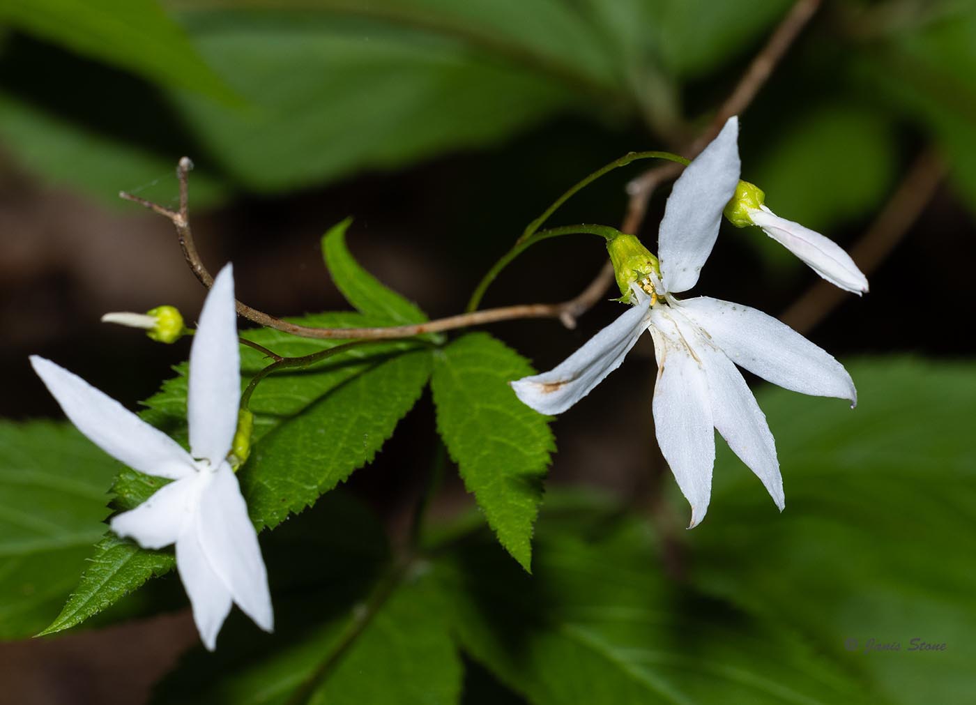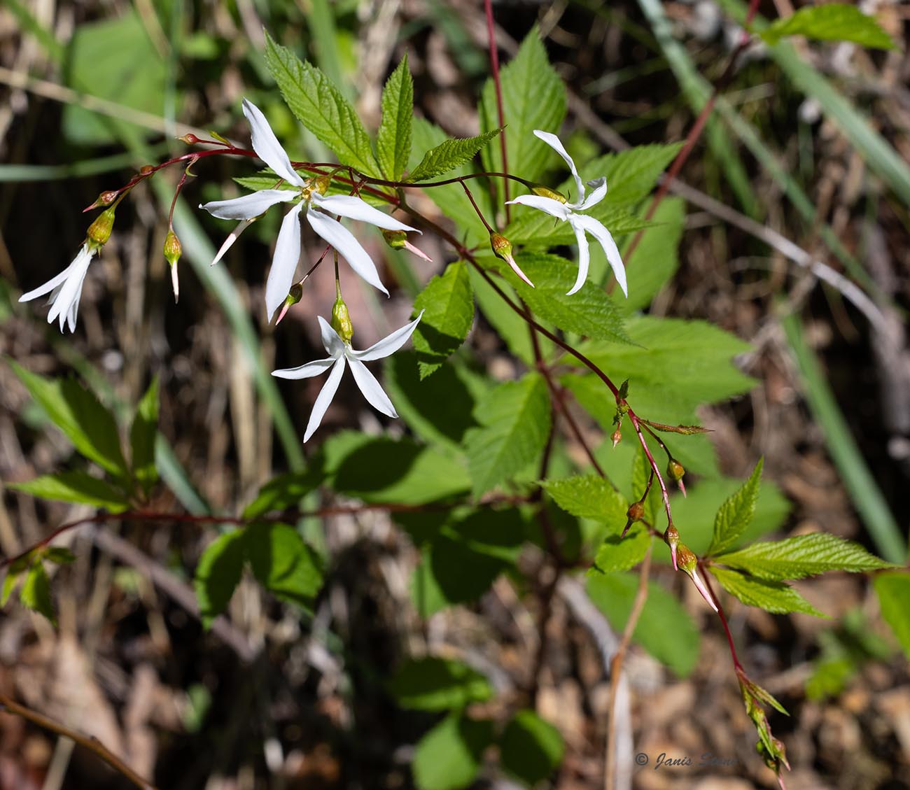 Bowman's Root has 3-lobed palmate leavees and narrow-petaled white to pink flowers.