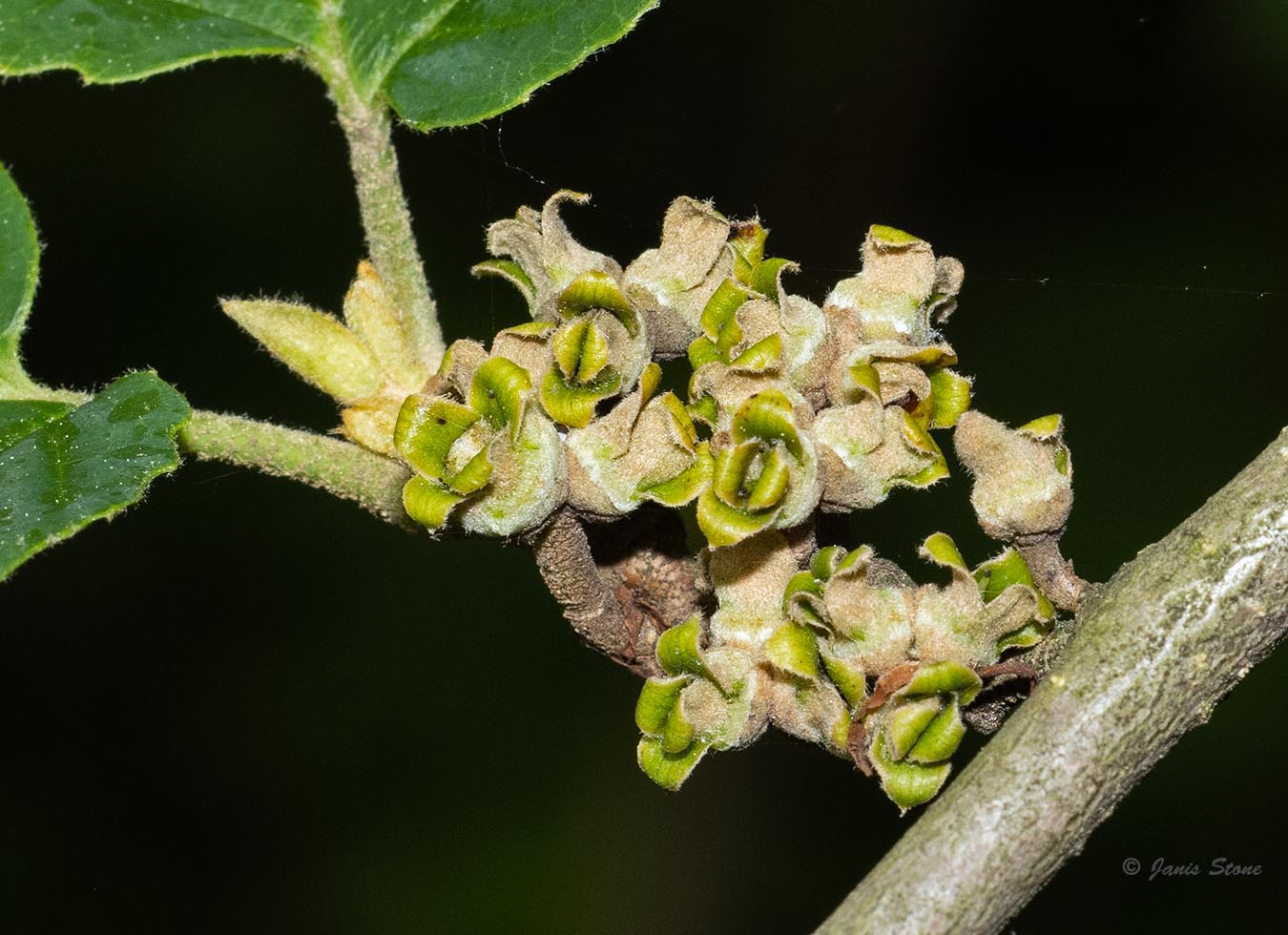 The leaves of Witch Hazel are often used by Witch-hazel cone gall aphids (Hormaphis hamamelidis or H. cornu) as a soruce of food and shelter. It causes the leaf to form a gall, which is light green at first then turns to red.