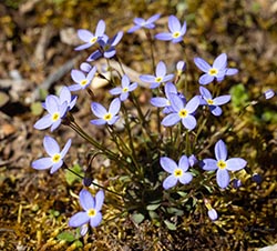 Our most common bluets, Common Bluets have pale azure-blue petals and a yellow center. The much less common Tiny Bluets (Houstonia pusilla) flowers have a purple-red and yellow center and bloom slightly earlier.