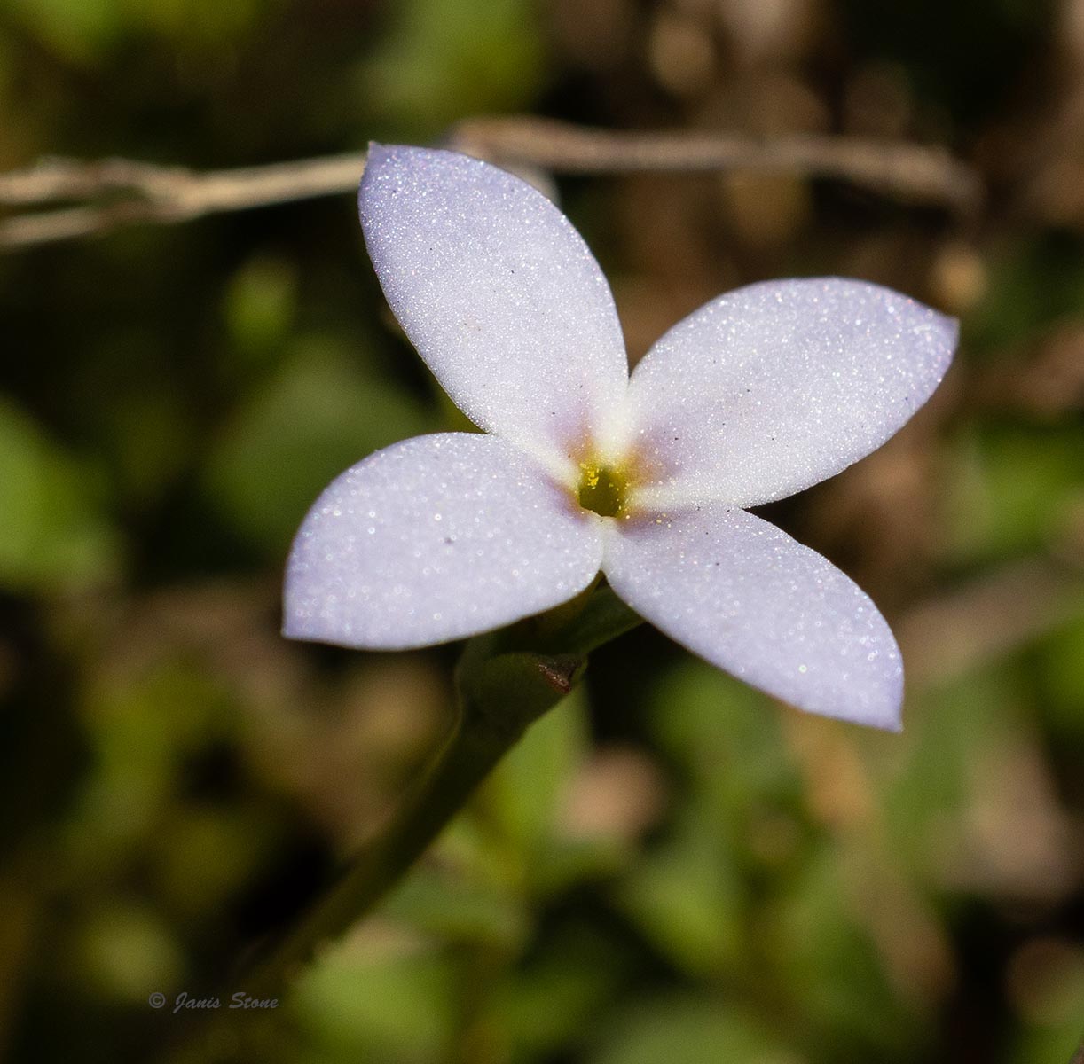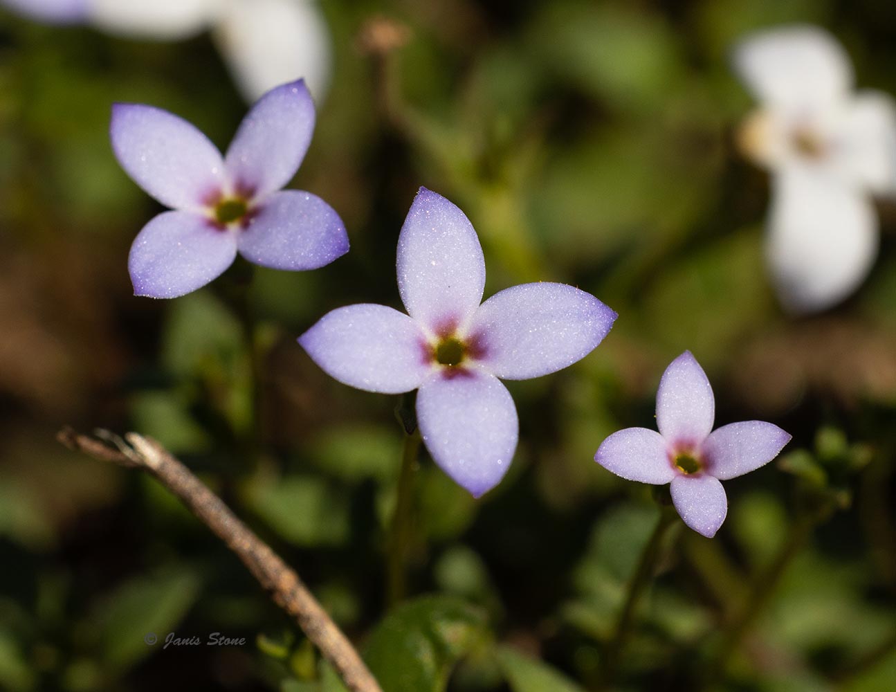 A smaller version of bluets, Tiny Bluets have beautiful flowers with azure-blue petals and a purple-red and yellow center. They bloom slightly earlier than the very similar Common Bluets (Houstonia caerulea)
