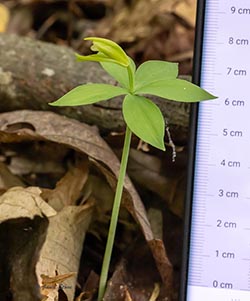 Although superficially resembling Cucumber Root, it bears its single flower above a single set of whorled leaves (usually 5 leaves, but it can have 3-6) whereas Cucumber Root usually bears its flowers under a second whorl of leaves. Also, its stem is glabrous and light green, unlike Cucumber Root's darker, pubescent and somewhat wiry stem.