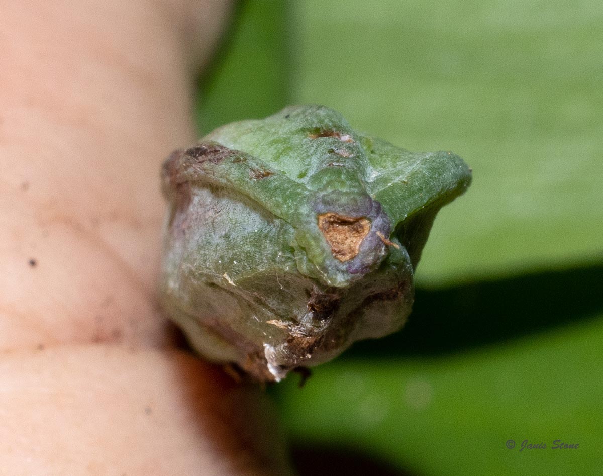 It is also similar to the Small Whorled Pogonia (Isotria medeoloides) (in the same genus). The Large Whorled Pogonia lower part of its stem is purplish (not green) and is generally taller (up to 35 cm high). The two species are most easily differentiated when in bloom. The Large Whorled Pogonia flower's sepals are brownish, not green, and the flower is separated from the whorled leaves by a longer pedicel (2-5 cm).