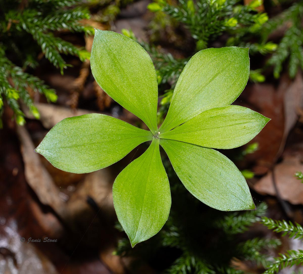 Although superficially resembling Cucumber Root (Medeola virginiana), it bears its single flower above a single set of whorled leaves (usually 5 leaves, but it can have 3-6). Also, its stem is glabrous, unlike Cucumber Root's pubescent and somewhat wiry stem.