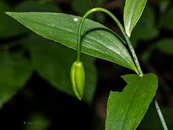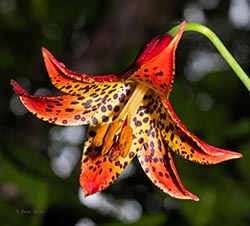 Canada Lily's nodding flowers range in color from brick-red to yellow. Its tepals are reflexed from their middle and have purple or brown spots on the inside for at least half of their length. Its leaves are typically in wholes of 415 leaves along the stem.