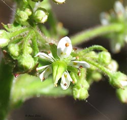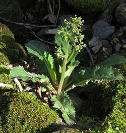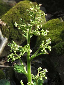 Lettuceleaf Saxifrage has basal leaves, with flowers borne in clusters on the top of leafless stems.