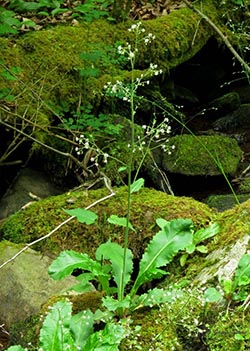It typically grows in forested rocky seeps, seepages swamps, and alongside streams.