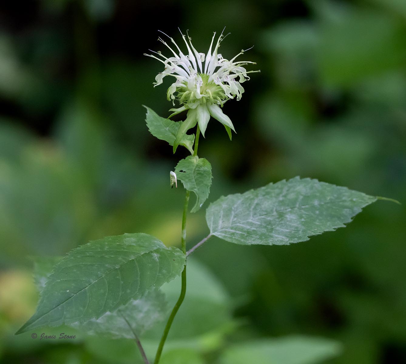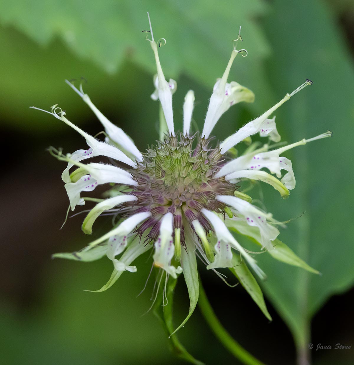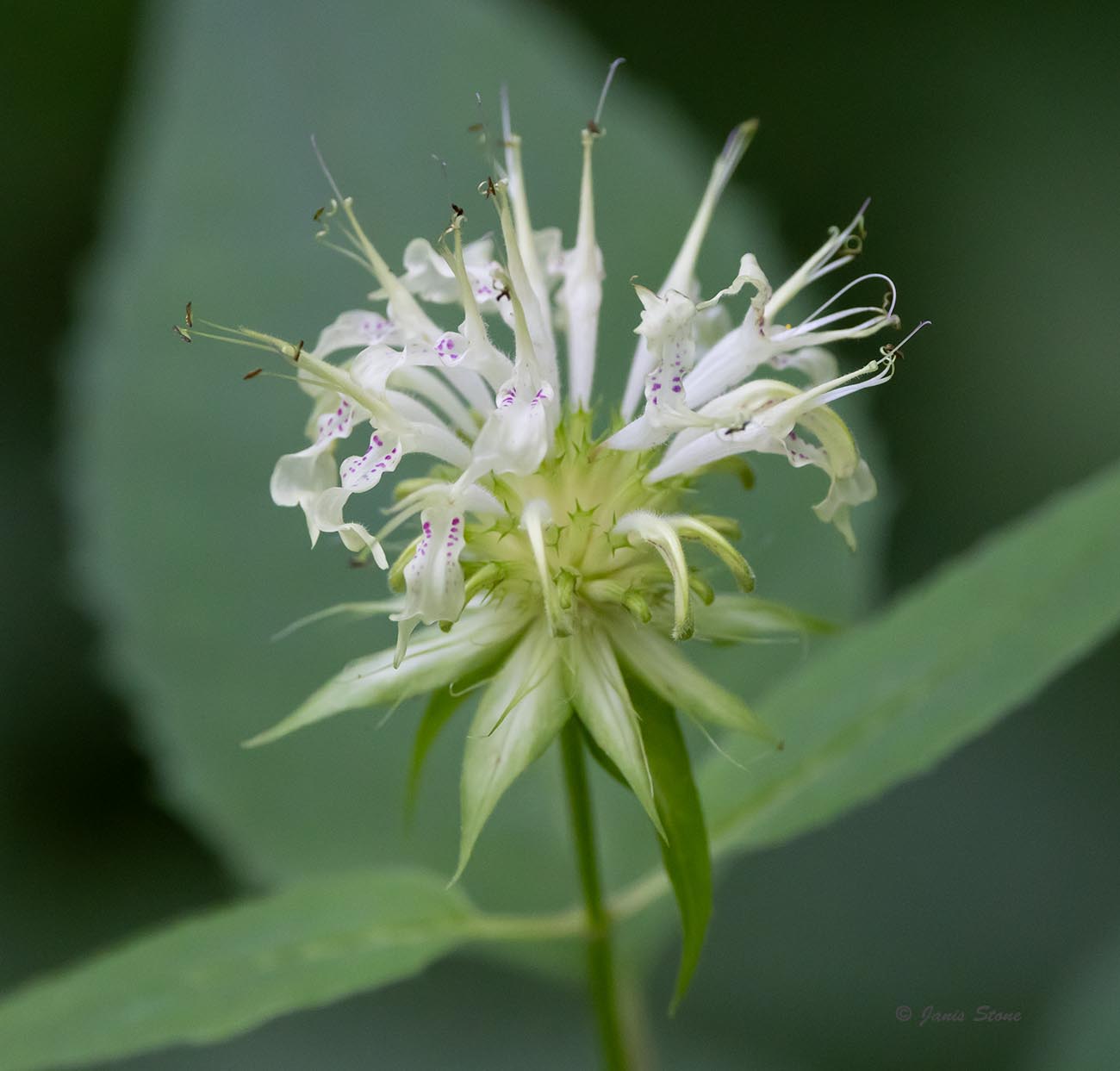 White Bergamot flowers can range in overall color from white to greenish to pale pink. The lower lip of its petals is purple-spotted.