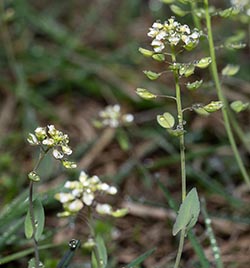 Perfoliate Penny-cress is an annual plant, native to Eurasia and North Africa. It bears small white flowers at the top of a single stem. Its basal leaves are ovate, with dentations. Its stem leaves are lanceolate and jagged, with their bases wrapped around the stem (i.e., perfoliate).