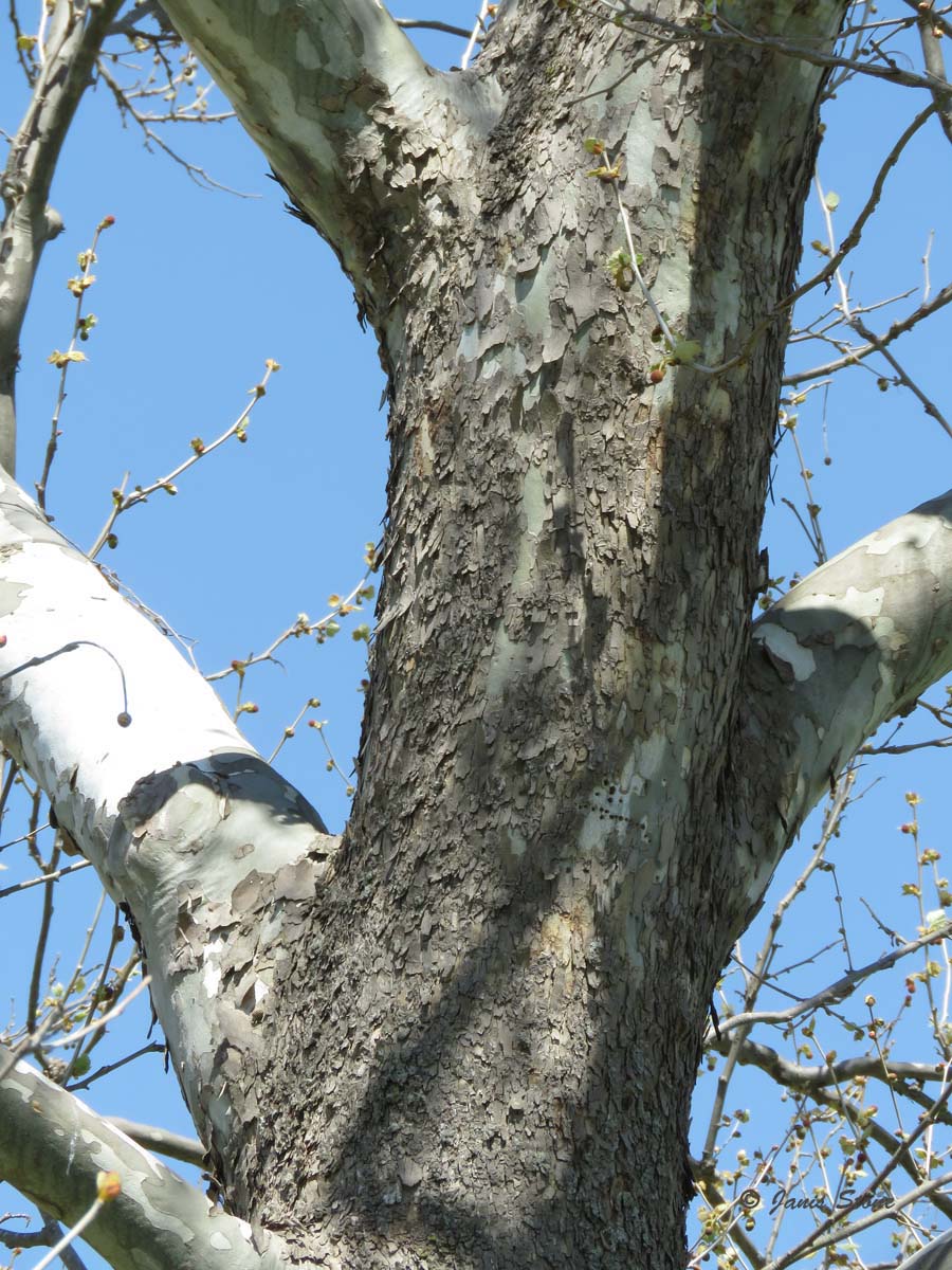 Sycamore has a characteristic mottled bark which flakes off in large irregular masses, leaving the surface mottled and gray, greenish-white and brown.