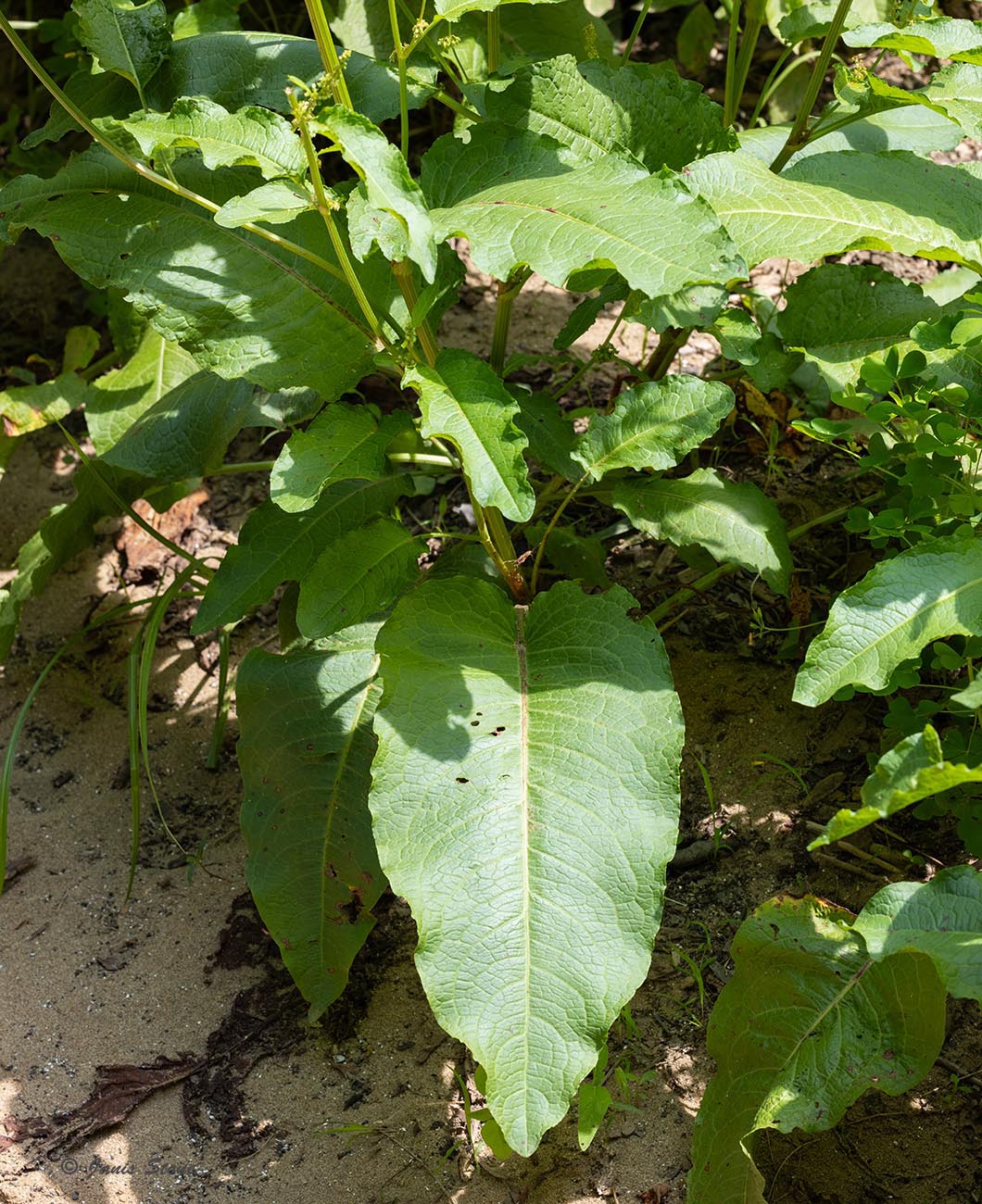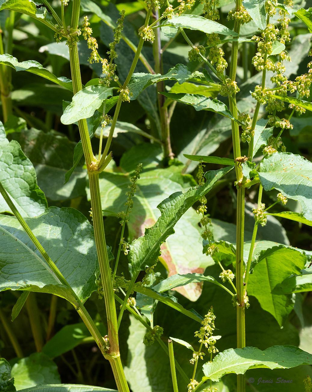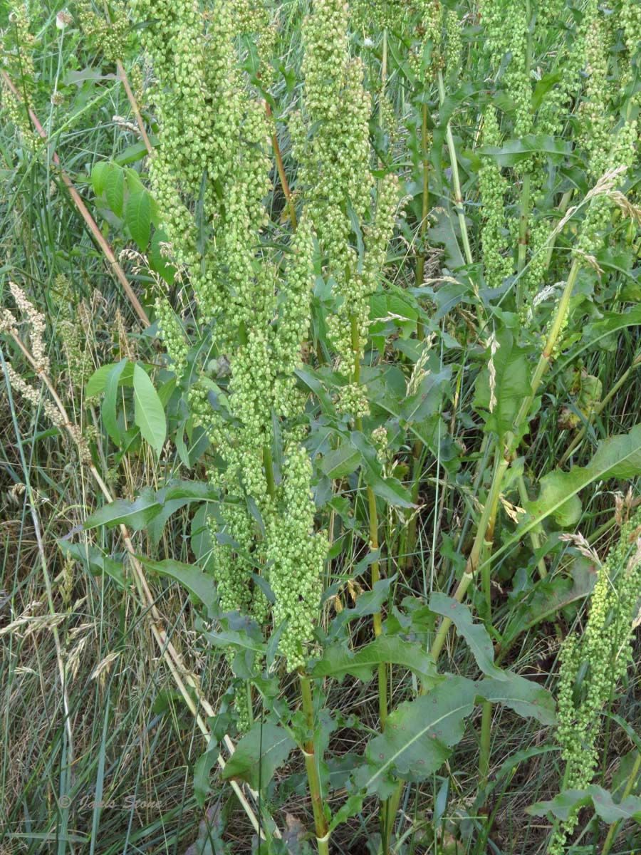 Curly Dock has large (1435 cm long) leaves with distinctive curly/waved edges. Its flowering stalk bolts up in late spring from a rosette of basal leaves. Each yellowish or reddish green flower is about 3mm long and consists of 3 inner sepals, 3 outer sepals, 3 styles, and an ovary. Each plant has both perfect (bisexual) and pistillate (female), which also have 6 stamens.
