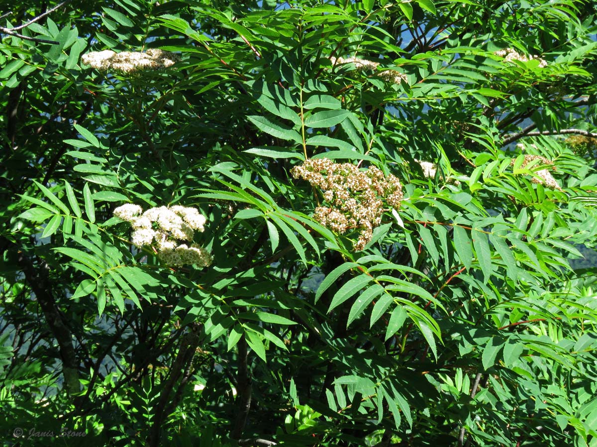 American Mountain-ash can be found in the higher elevations of the mid-Atlantic area and further north as either coarse shrubs or trees up to 15m high. Its white flowers are borne in flat compound cymes 620cm across. In autumn, it forms red berry-like pomes that persist through winter.