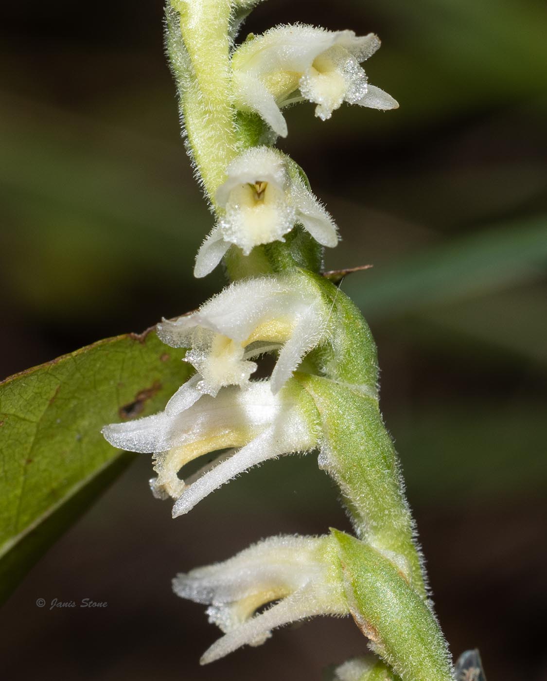 According to Zachary R. Bradford's article in Sempervirens, The Quarterly of the Virginia Native Plant Society, Summer 2022, Spring Ladies'-tresses flowers are carried in a tight to loose spiral on the stem, and are white with pale yellow lips that often have a pair of orange spots caused by necrotic tissue. Its sharp-tipped hairs that cover most surfaces of the flowering stem are visible under magnification. Its unique combination of characteristics are: