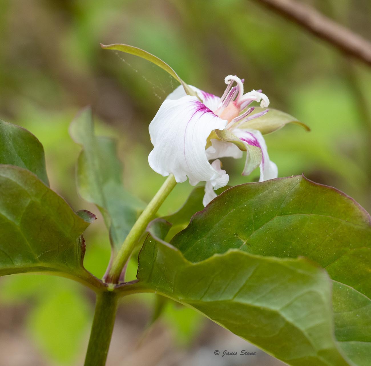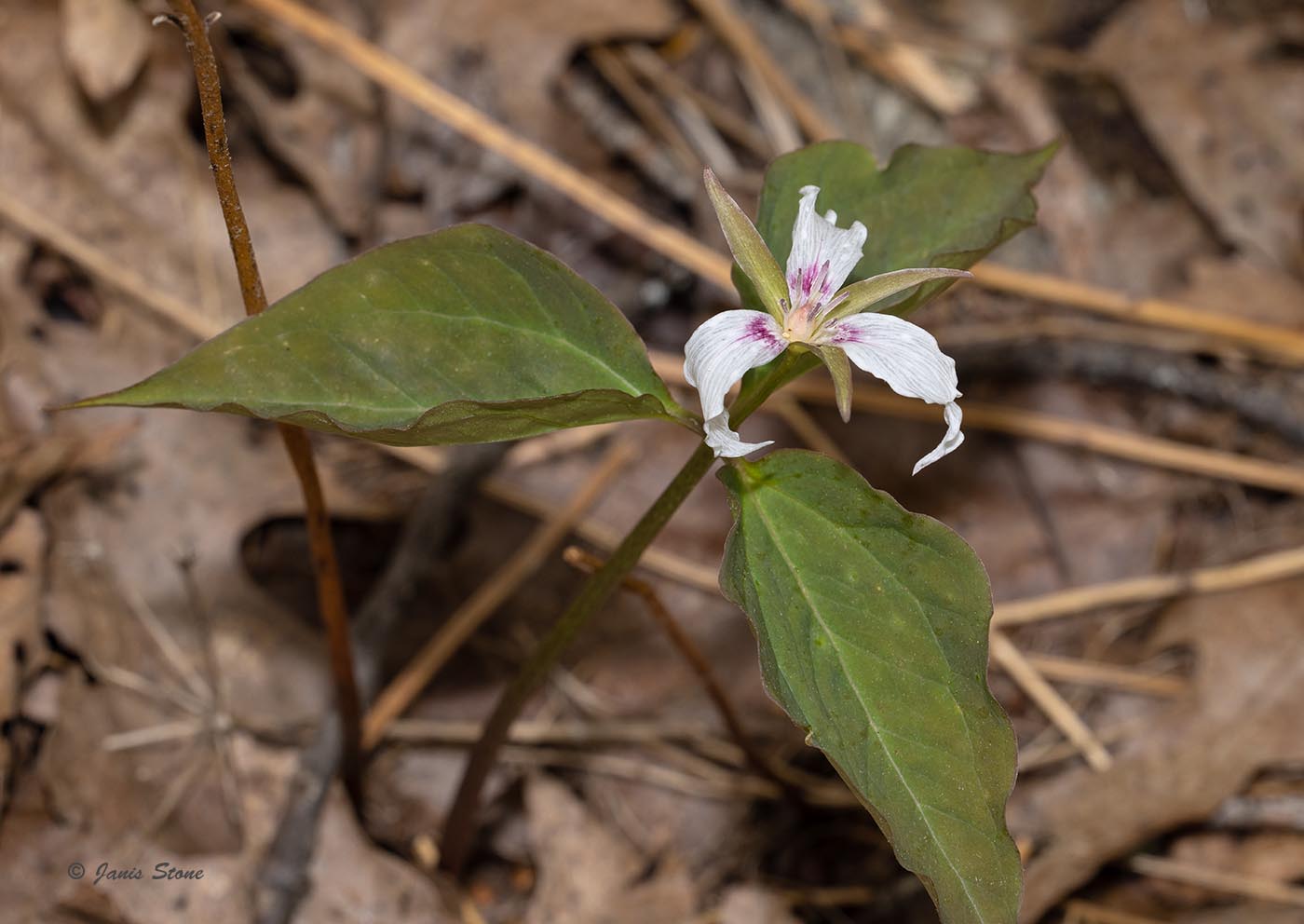 Painted Trillium's Latin species name undulatum means wavy, referring to its petals' wavy margins. Its petals are white, typically with an inverted red "V" near their base (rarely, some specimens may lack the red "V").