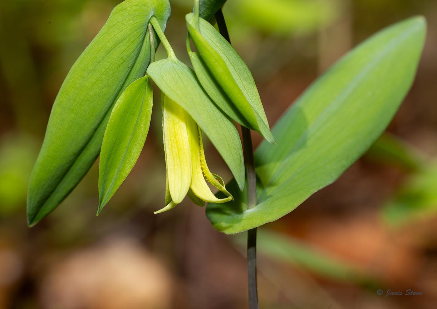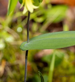 The genus is named Uvularia because the flower hangs down like the uvula in the back of your throat; the species name perfoliata reflects the fact that the stem seems to perforate the base of the leaves.
