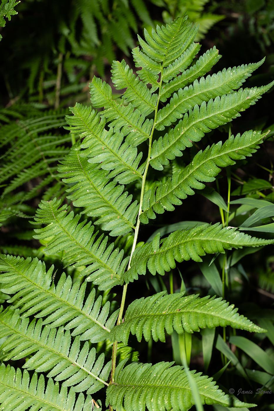 Goldie's Wood Fern has a large blade with an abruptly pointed tip. Its sori are close to the midvein on the pinnae.
