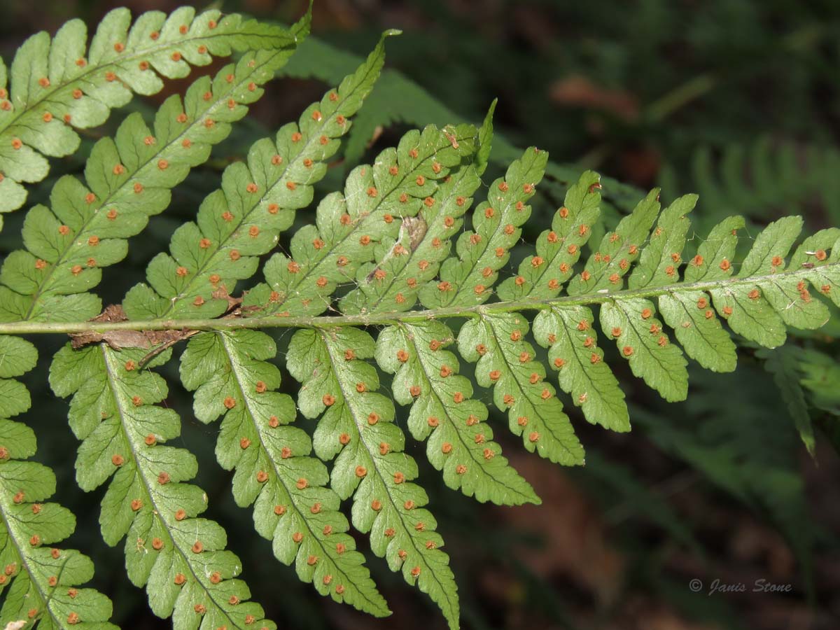 Marginal Wood Fern is evergreen, which makes it easier to find and identify in the winter. It grows from a clump and may have dead fronds accumulated under it. Marginal Wood Fern's stipes are about 1/4 the length of the frond and are covered in bright golden scales; the basal pinnules are longer than adjacent pinnules. Its sori (spore structures) are near the margins of its segments.