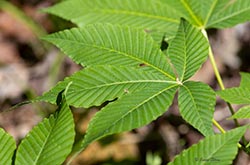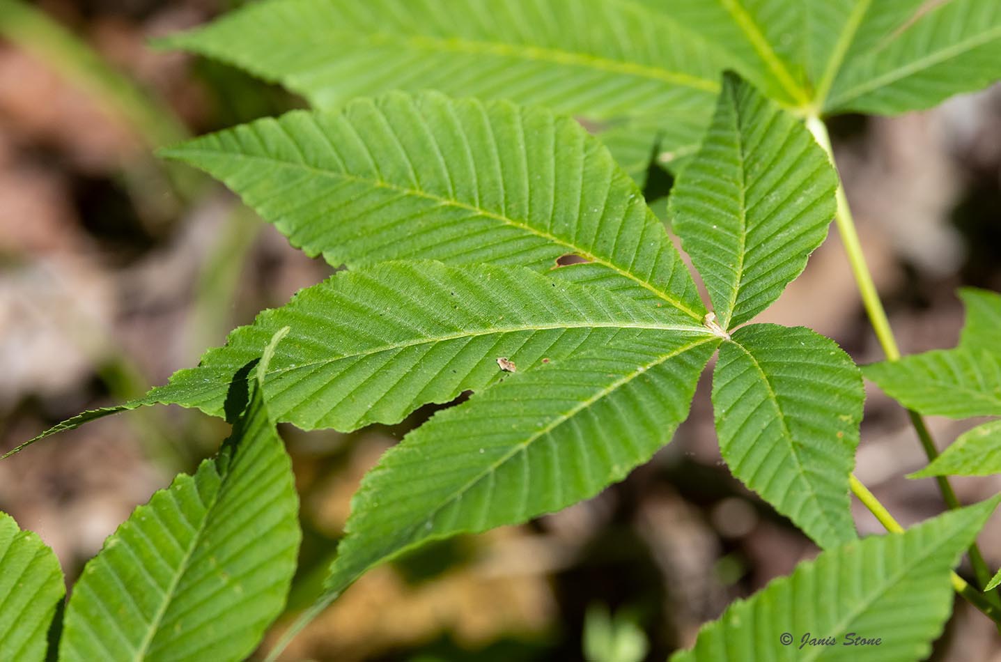 Common Buckeye is one of the largest, most massive, and commonly encountered trees in Southern Appalachian coves, recognizable in winter by the bark of large plate-like slabs, thick twigs, and massive form. In spring and summer, look for its opposite palmately-compound leaves; its leaves usually turn orange to red in the fall.