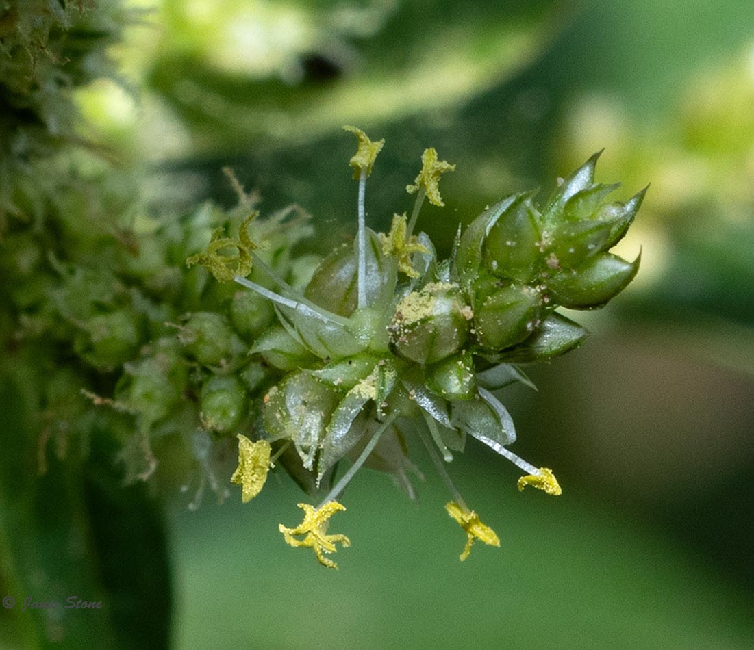Spiny Amaranth, true to its common name, has spikes present on the flowers and spines present at nodes. Its flowers are green, lack petals, and have terminal and axillary spikes. Male flowers are at the end of the flower spike, while the female flowers are at the bottom.