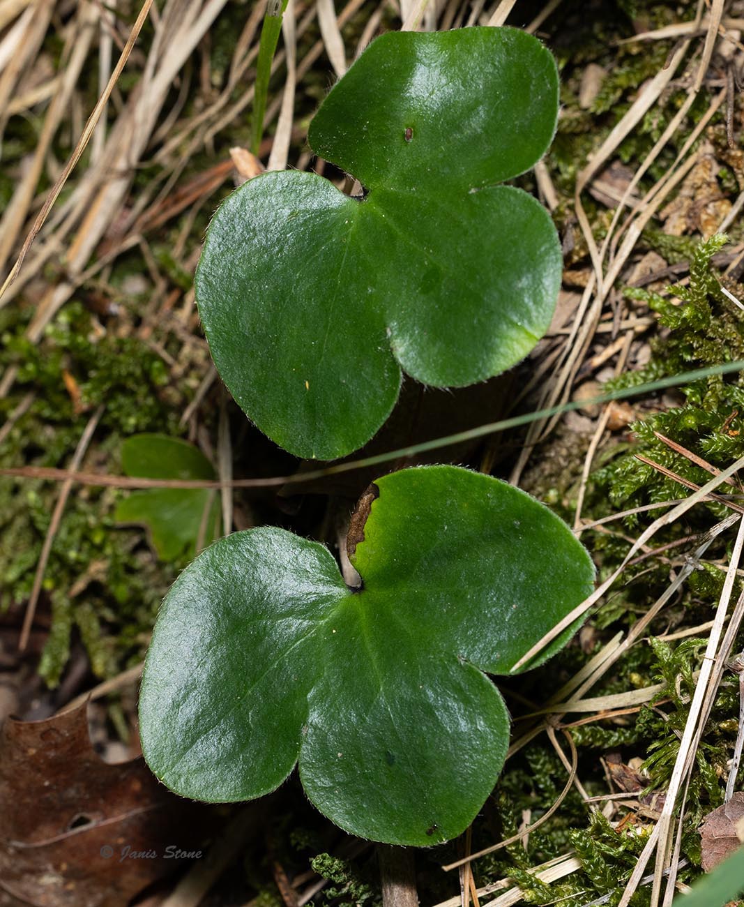 Round-lobed Hepatica flowers range in color from blue/violet (most common) to white. New leaves start out bright green, then turn mottled and eventually darker.