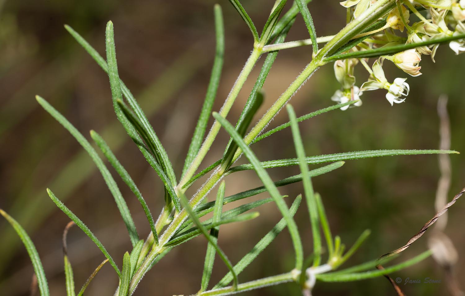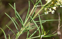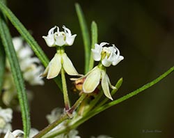 The leaves of Whorled Milkweed are narrow, and mostly whorled around the main stem, giving the plant its common name. The "horns" of each white-green flower extend well above the "hoods" toward the center of the flower.