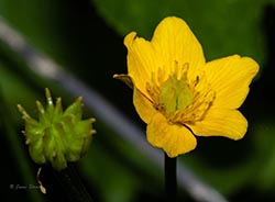 Marsh Marigold, with its bright yellow flowers and green violet-like leaves, is most often found in wet areas such as seepage swamps, fens, bogs, and along river banks. The flower petals have conspicuous nerves.