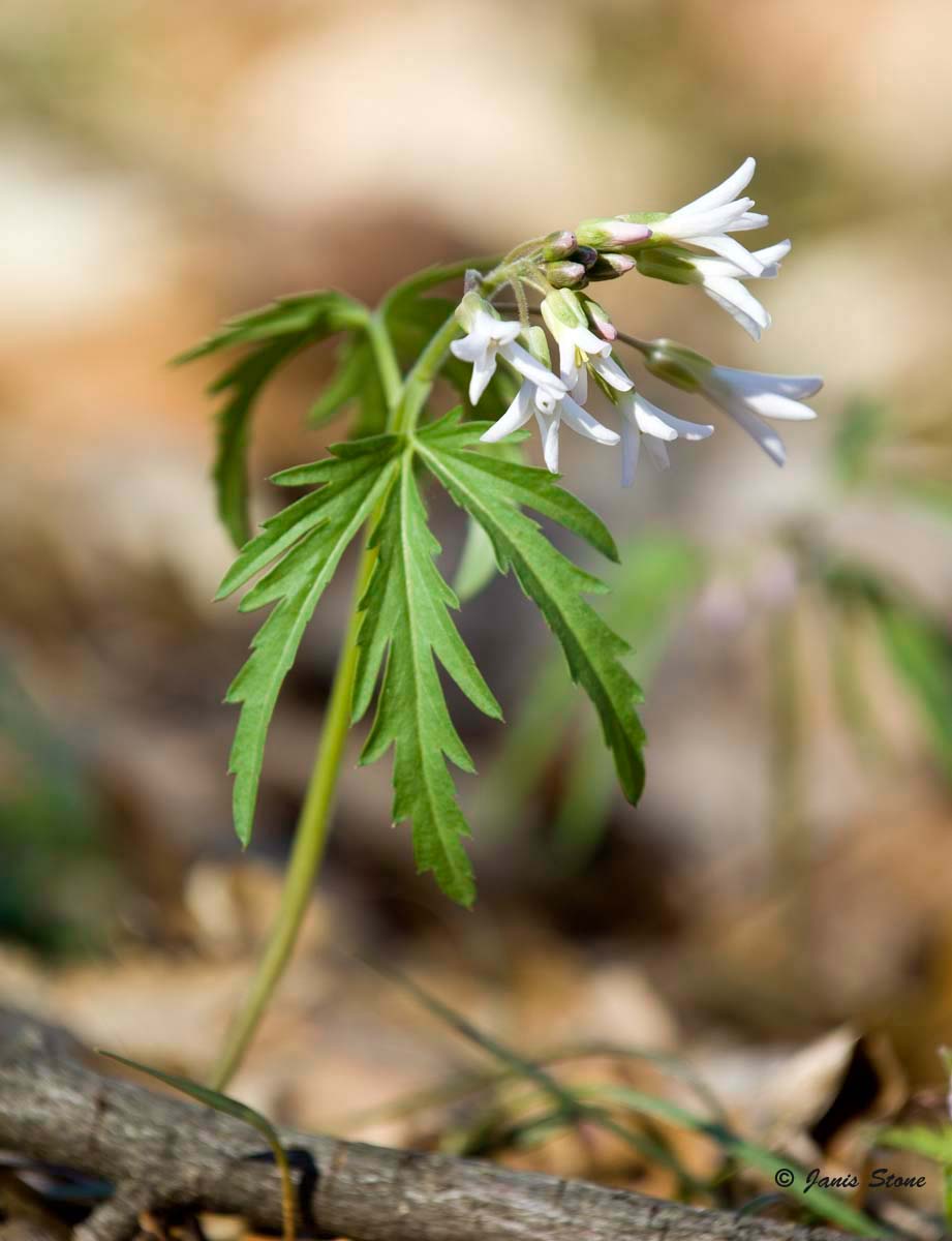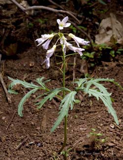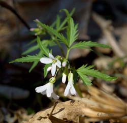 Compare with Slender Toothwort (Cardamine angustata) which usually has only two sets of leaves coming off its stem, only slightly cut leaflets, and which may have larger, ovoid basal leaves at flowering time. Slender Toothwort's flowers tend to be pinker than Cut-leaf Toothwort's white or almost white flowers (except in bud stage).