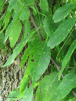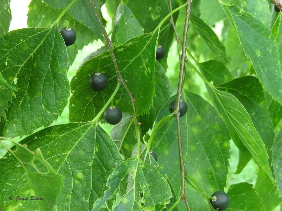 Common Hackberry's bark is recognizable by its deep furrows and corky ridges or warty appearance. It is a long-lived tree that typically grows 40 to 60 feet tall but can reach 130 feet in ideal conditions. Its fruit is a pea-sized drupe with edible sweet flesh.