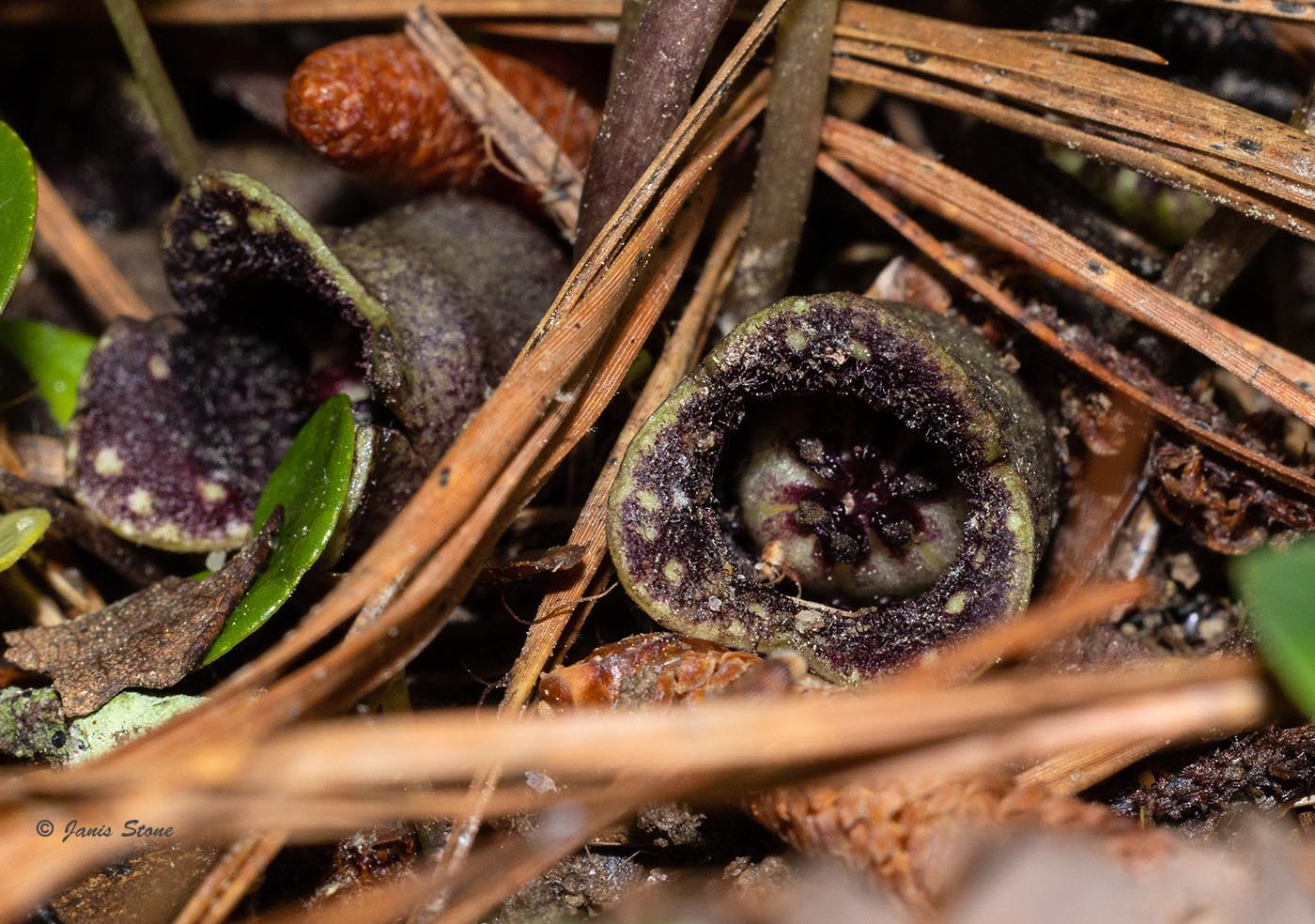 Weakley's 2025 Flora of the Southeastern United States1 differentiates between the two genera by noting that Hexastylis species' leaves are evergreen, glabrous, and not paired, whereas Asarum's leaves are deciduous, pubescent, and paired.