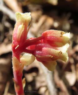 Similar in overall appearance to Indian Pipe (Monotropa uniflora), but with more than one flowering head on each stalk. Like Indian Pipe, Pinesap's flowering heads droop initially, then turn upright, giving it its species name monotropa, meaning "once-turned". Two color variations exist, with yellow-tawny plants usually appearing in late spring to early summer, and pink or reddish plants appearing in the late summer to fall.