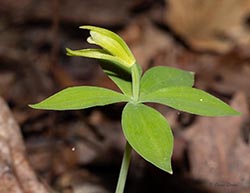 Although superficially resembling Cucumber Root, it bears its single flower above a single set of whorled leaves (usually 5 leaves, but it can have 3-6) whereas Cucumber Root usually bears its flowers under a second whorl of leaves. Also, its stem is glabrous and light green, unlike Cucumber Root's darker, pubescent and somewhat wiry stem.