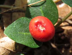 The fruits (berries) are actually the result of two paired flowers that fuse into one 2-part bright-red fruit. In one of these flowers, the pistil is short and the stamens are long; in the other, the pistil is long and the stamens are short. As a product of the fusion of these two flowers, the resulting fruit has two spots on its surface. The fruits can persist through the winter if not eaten by wildlife.