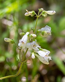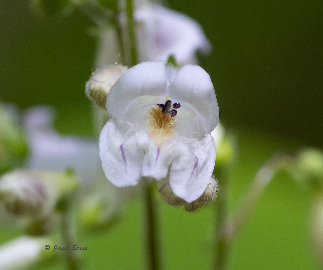 Pale Beardtongue's corolla is white with fine purple lines. Its corollas have an open throat, with their lower lobes projecting beyond the upper lobes.