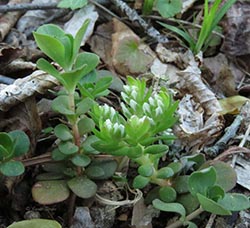 Wild Stonecrop has white flowers, and succulent leaves whorled in groups of three.