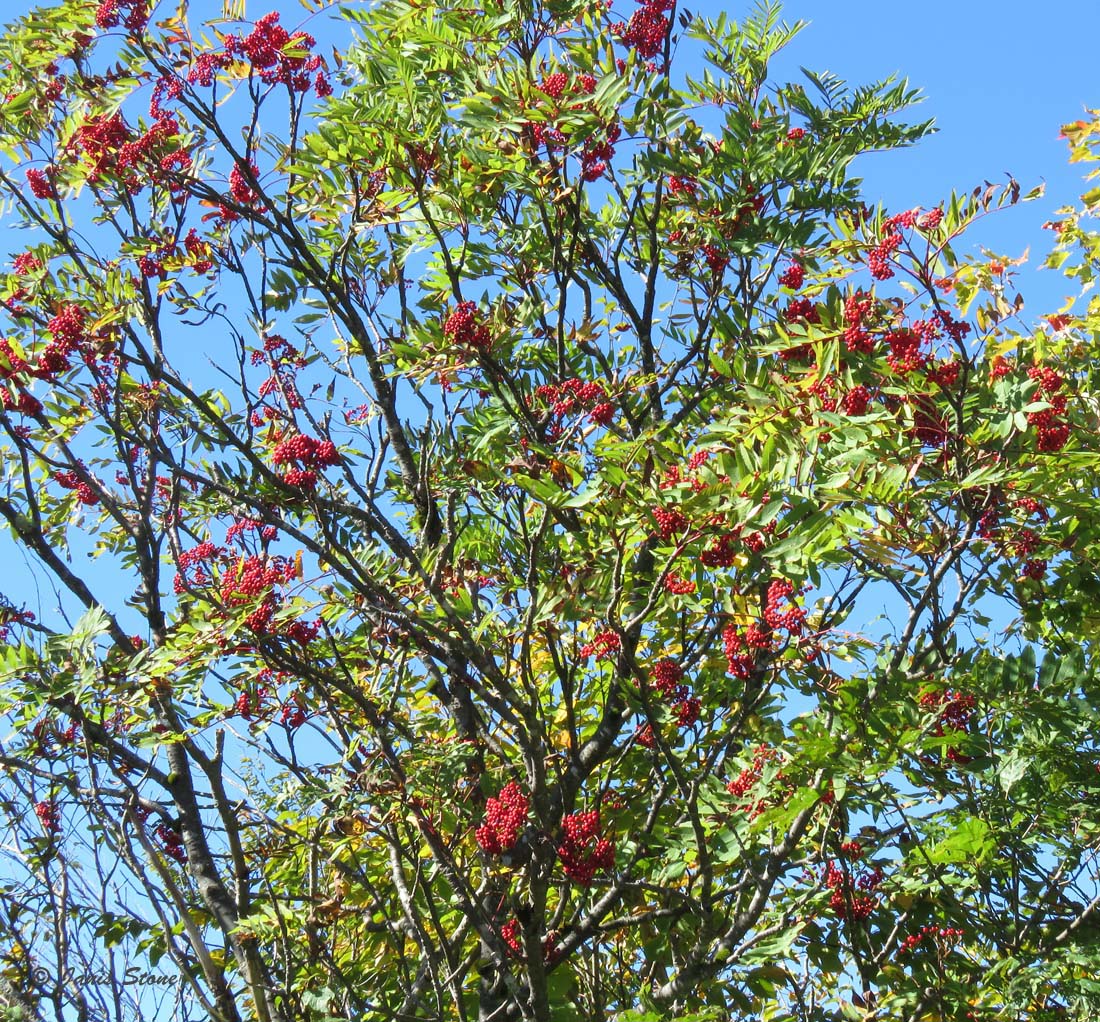 American Mountain-ash can be found in the higher elevations of the mid-Atlantic area and further north as either coarse shrubs or trees up to 15m high. Its white flowers are borne in flat compound cymes 620cm across. In autumn, it forms red berry-like pomes that persist through winter.