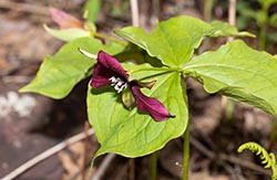 Red Trillium has one nodding flower, with an unpleasant odor (hence the alternative common name Stinking Benjamin). Note that its flowers have a long (1-9cm) pedicel.