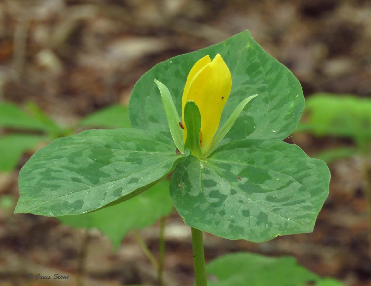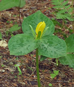 Yellow Trillium is rare but can be found planted as a specimen plant. It grows mostly in the mountains, with its native range in the Great Smoky Mountains and surrounding areas.