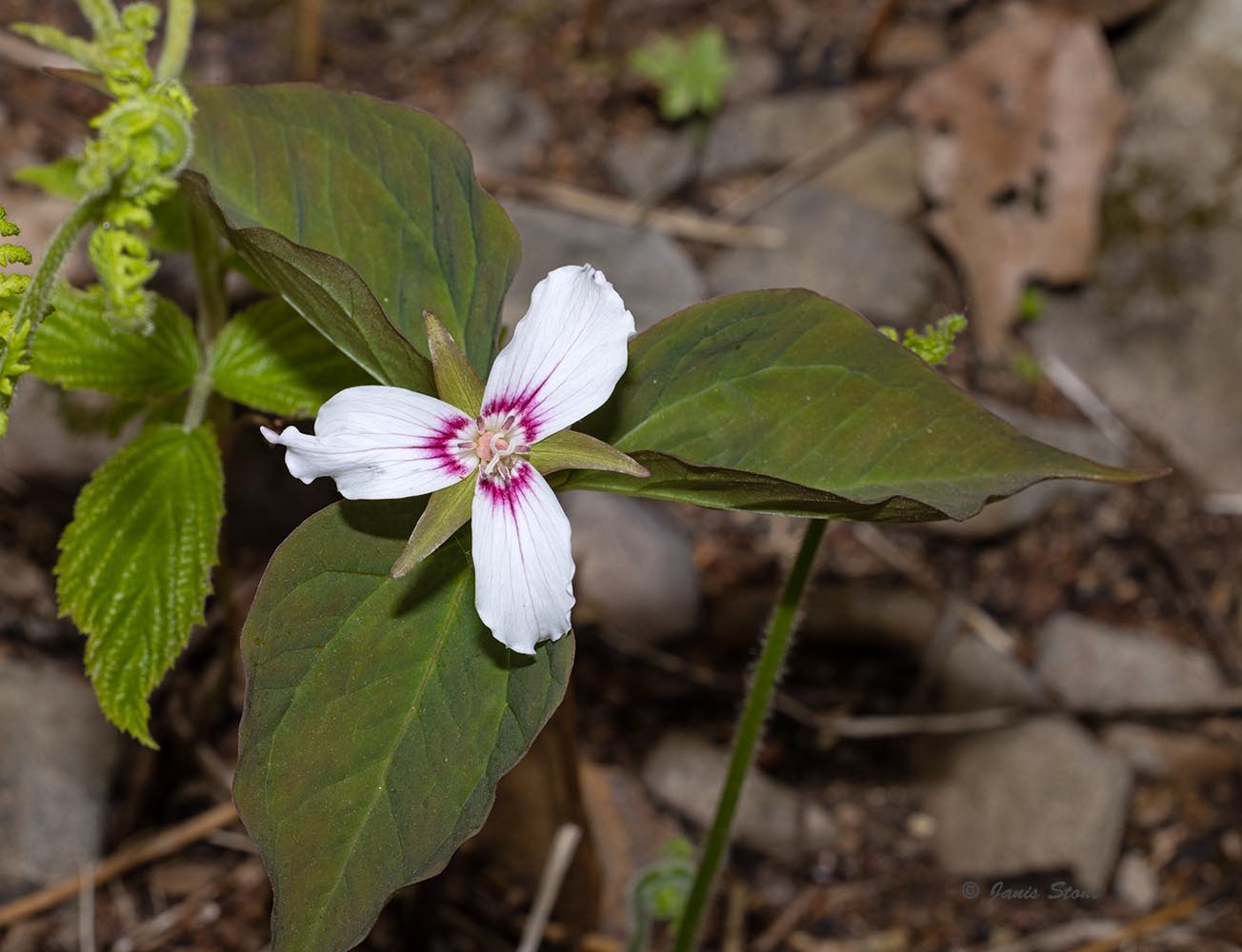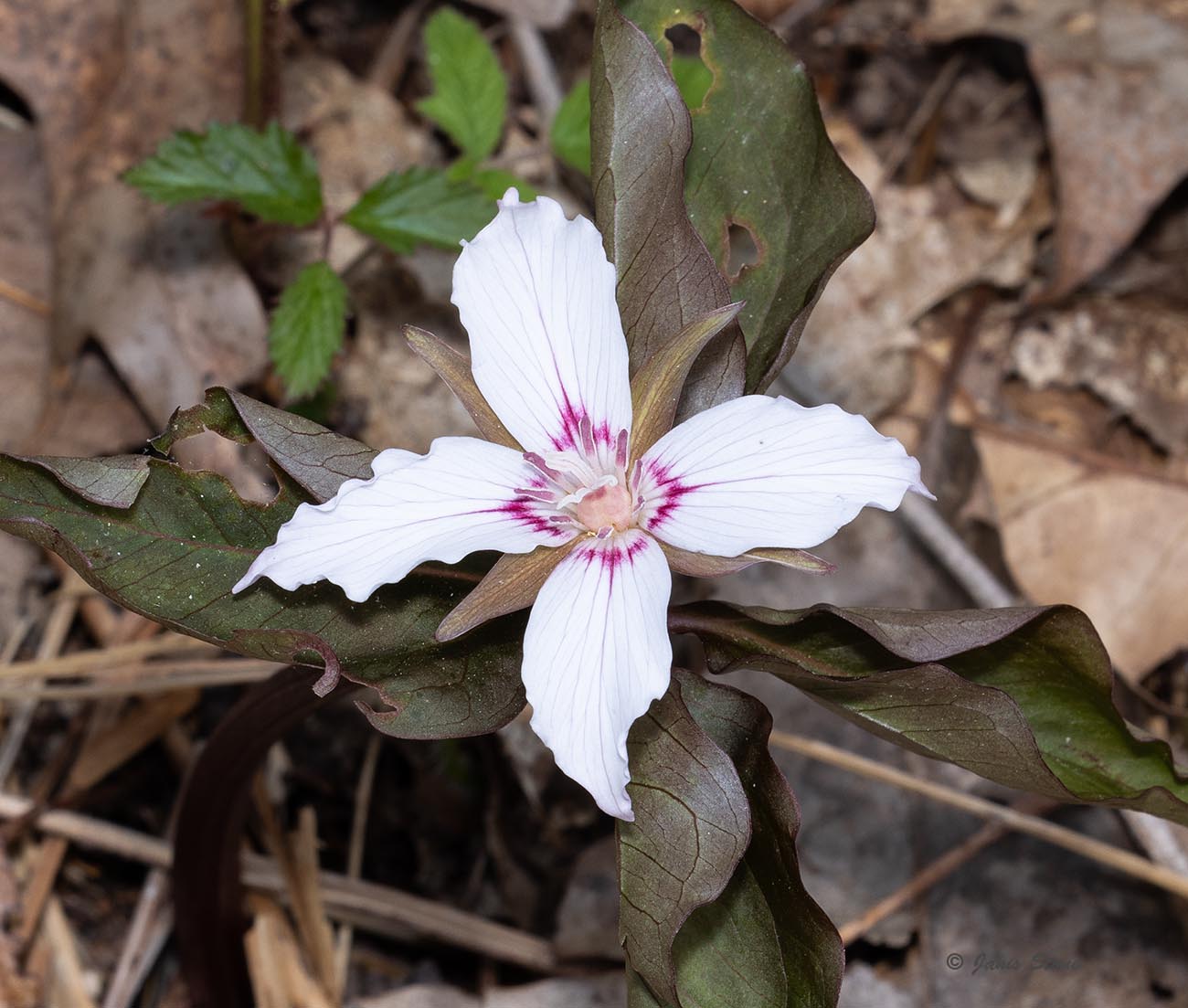 Painted Trillium's Latin species name undulatum means wavy, referring to its petals' wavy margins. Its petals are white, typically with an inverted red "V" near their base (rarely, some specimens may lack the red "V").