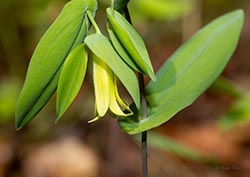 The genus is named Uvularia because the flower hangs down like the uvula in the back of your throat; the species name perfoliata reflects the fact that the stem seems to perforate the base of the leaves.