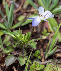 Field Pansy has above ground stems and blue-white flowers with blue veins. The lowest petal usually has yellow near its base.