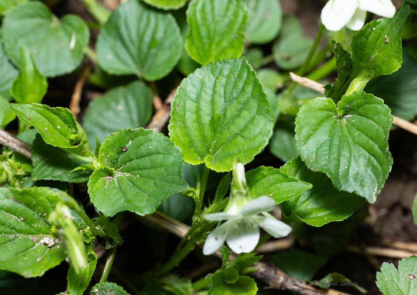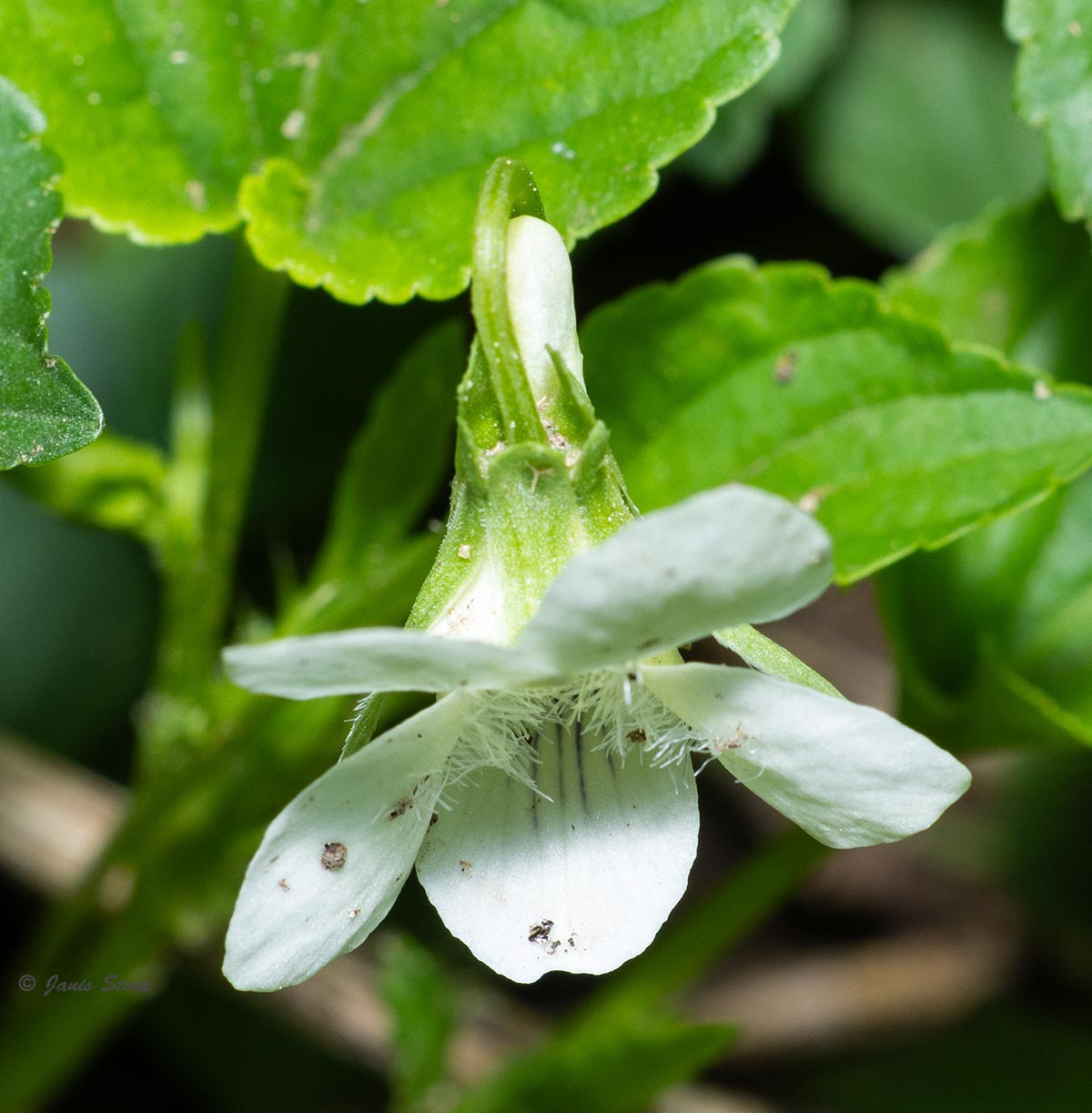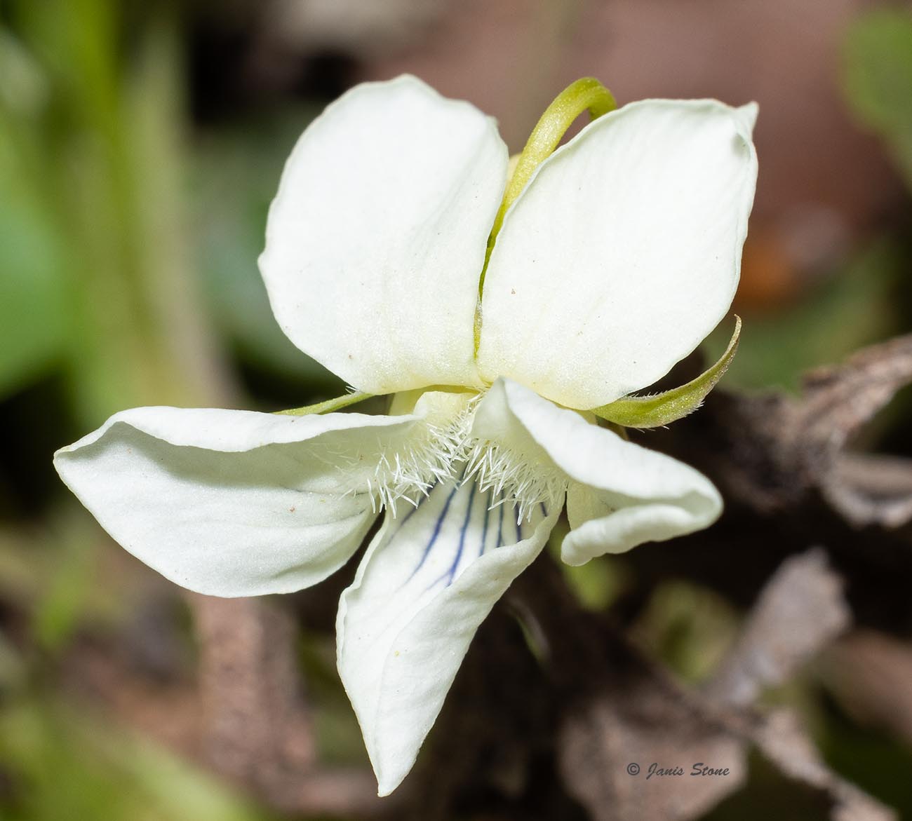 Cream Violets' open corollas of are completely ivory- or cream-colored, with blue, to brown-purple, to purple veins near their base. Its stems are ascending-to-erect at the time of flowering and fruiting, and its leaves are hairless or nearly so.
